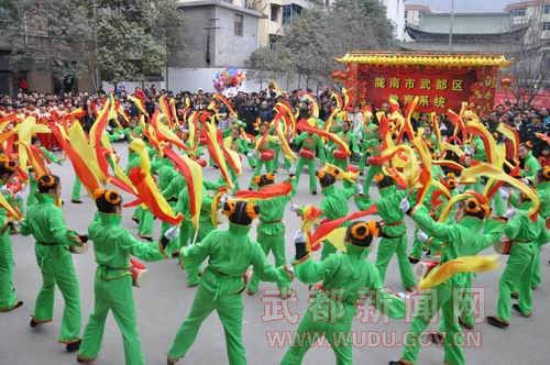 连日来,武都城区各条街道上锣鼓喧天,热闹非凡,耍狮子、舞大龙、跑旱船、打花鼓,节目一个比一个精彩。春节期间,由全区各系统组织的龙狮社火队纷纷上街表演,在“热烈、祥和、节俭、安全”的气氛中,为城乡数万群众奉送上了一道道精美的节日大餐。(李小鹏摄)