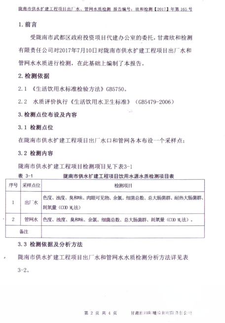 按照区政府及主管局定期向市民公布自来水水质检测结果的安排,为了让市民对所饮用的市政自来水水质有所了解,使市民饮用到放心水,陇南市武都区政府项目代建办公室对陇南市供水扩建工程项目出厂水、管网水质委托甘肃欣和环境监测有限责任公司做了抽检化验,所抽检结果全部符合GB5749-2006生活饮用水水质标准。现将抽检结果予以公布。
