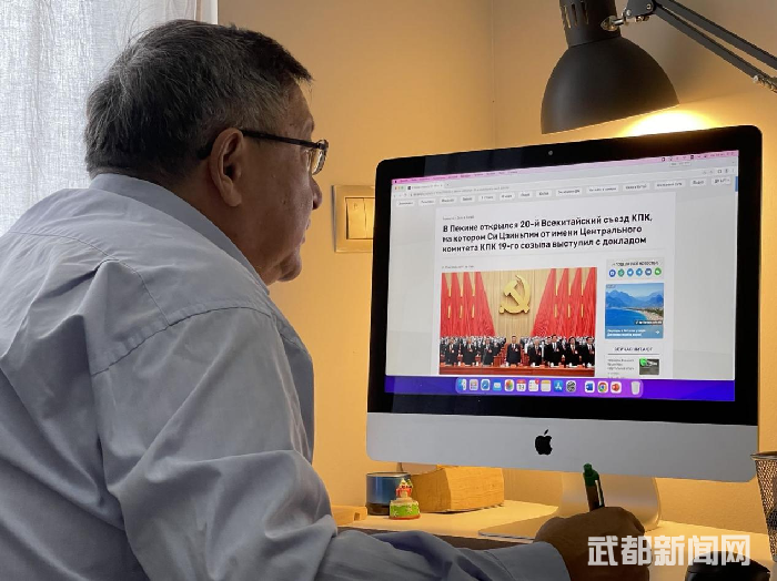 《哈萨克斯坦实业报》总编辑谢里克·科尔茹姆巴耶夫浏览中共二十大相关新闻。受访者供图